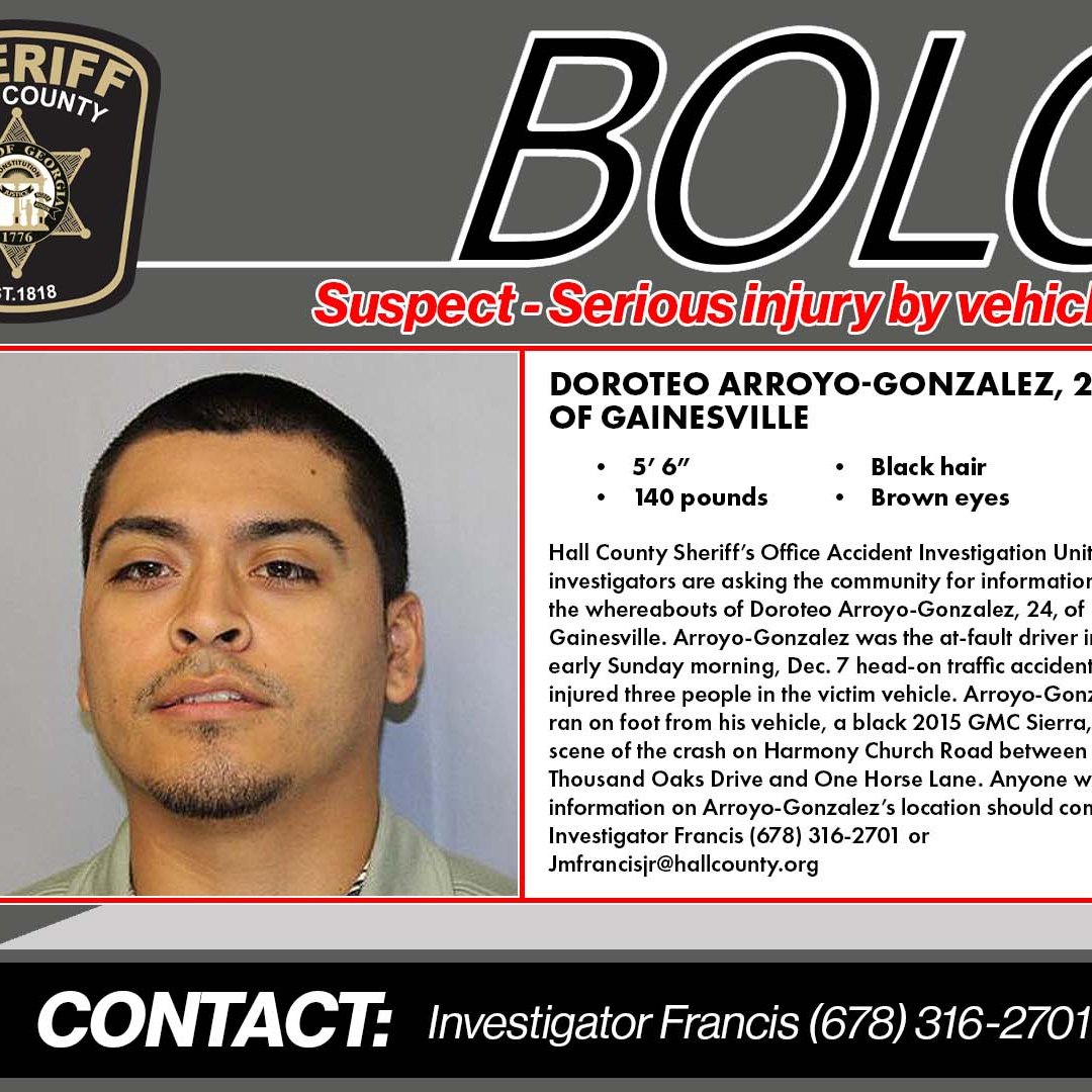 Sheriff’s Office searching for man accused of injuring 3 people in head-on crashThe Hall County Sheriff’s Office is asking the public to be on the lookout for a man accused of causing a head-on crash Sunday, Dec. 7, that injured three people.December 12, 2025 -