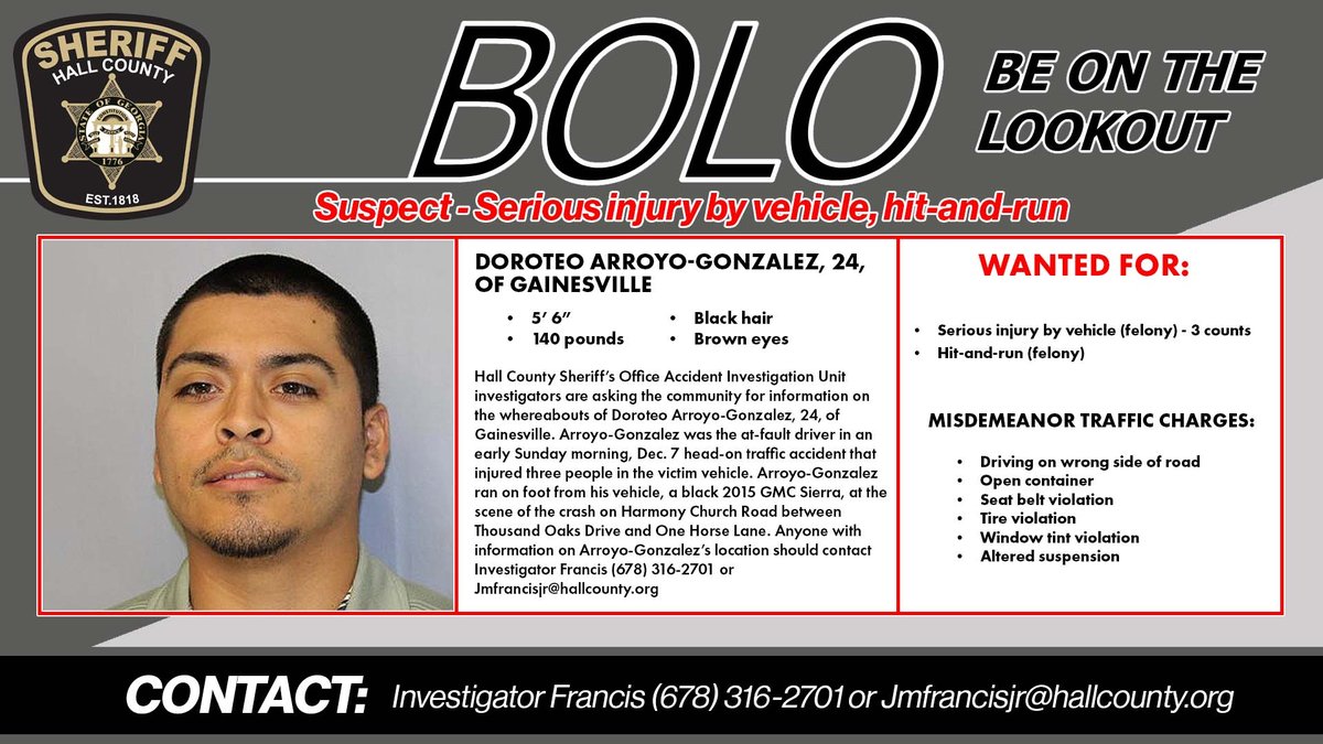 The Hall County Sheriff’s Office is asking the public to be on the lookout for a man accused of causing a head-on crash Sunday, Dec. 7, that injured three people.
